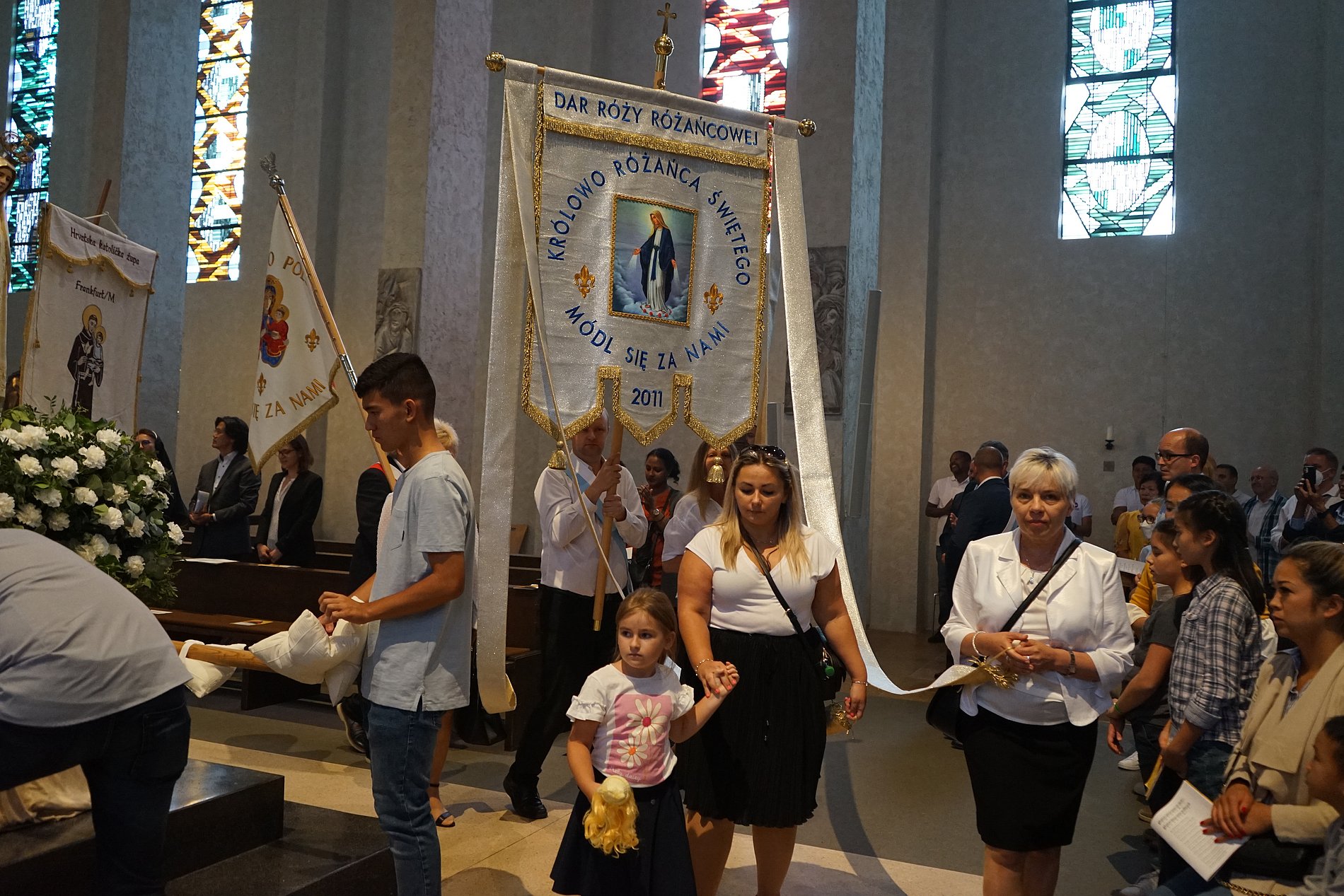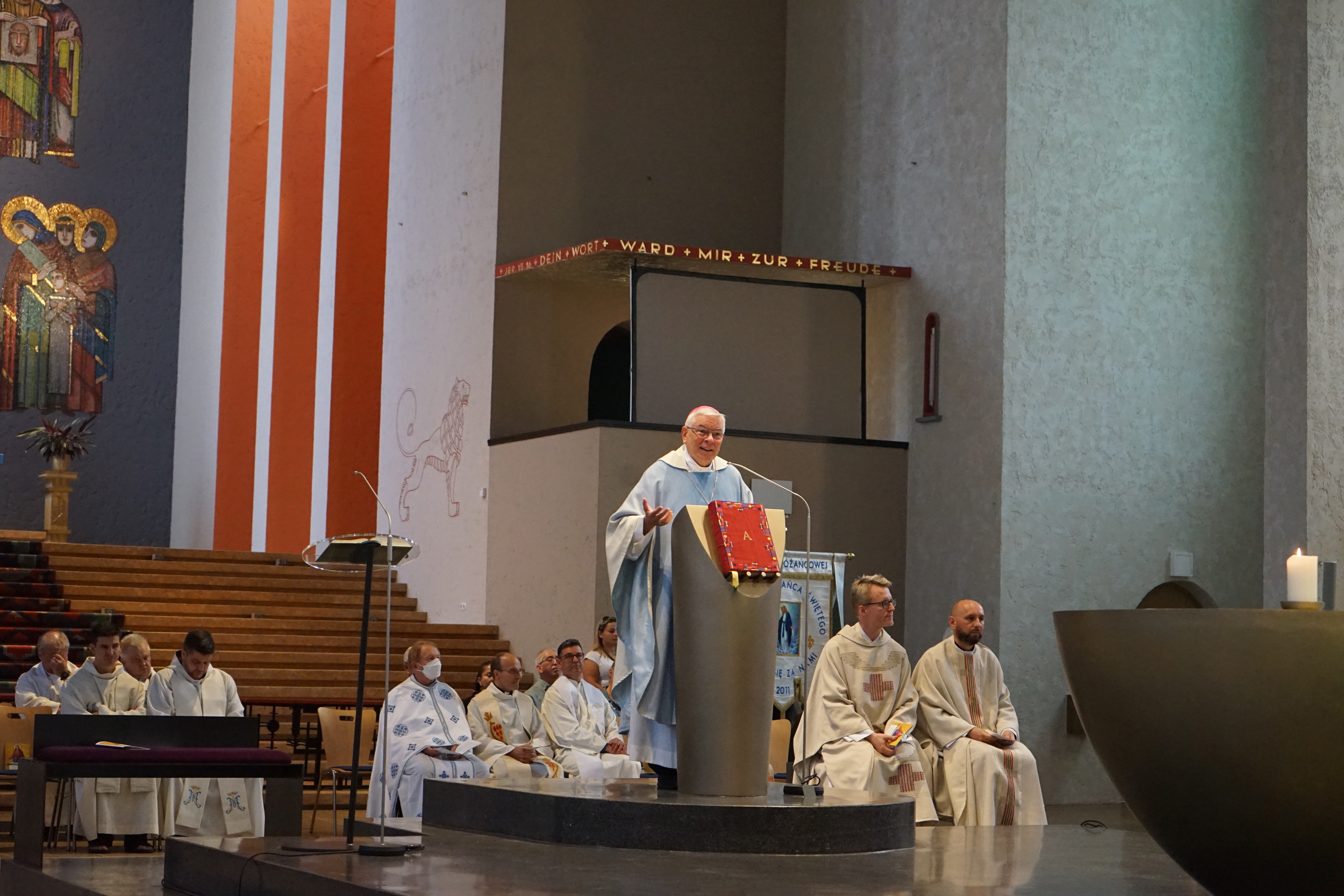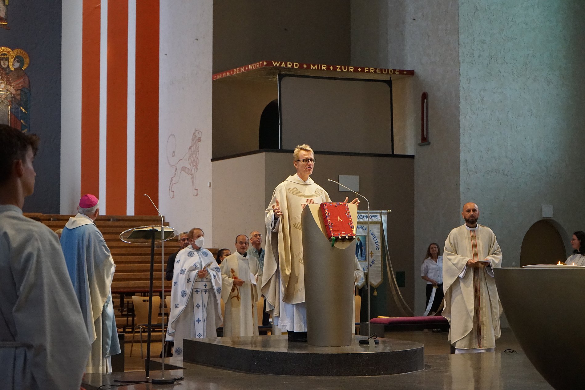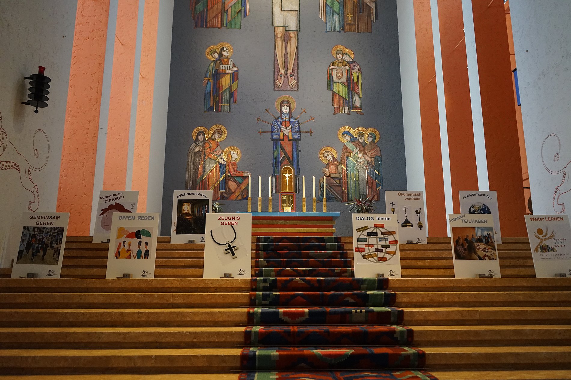 Die in der jeweiligen Sprache vorgetragenen Fürbitten aus den einzelnen muttersprachlichen Gemeinden sind ein zentrales Element des Mariengottesdienstes, der jedes Jahr in zeitlicher Nähe zum Fest Mariä Geburt gefeiert wird. Gebetet wurde für alle Gläubigen in den Kirchen und Pfarreien, für alle ehrenamtlich Engagierten, für die Getauften aller Konfessionen und für die, die sich taufen lassen, für jene, die sich für Verkündigung einsetzen – und auch für Papst Franziskus und seine Botschaft. Die Fürbitte der Ukrainischen Katholischen Personalpfarrei bat um die Förderung einer Kultur des offenen Austauschs und der gemeinsamen Meinungsbildung. Anschließend brachten Frauen und Männer aus den Gemeinden anderer Muttersprachen Tafeln mit Symbolen zu den Schlüsselthemen des Synodalen Prozesses sowie die eucharistischen Gaben zum Altar.