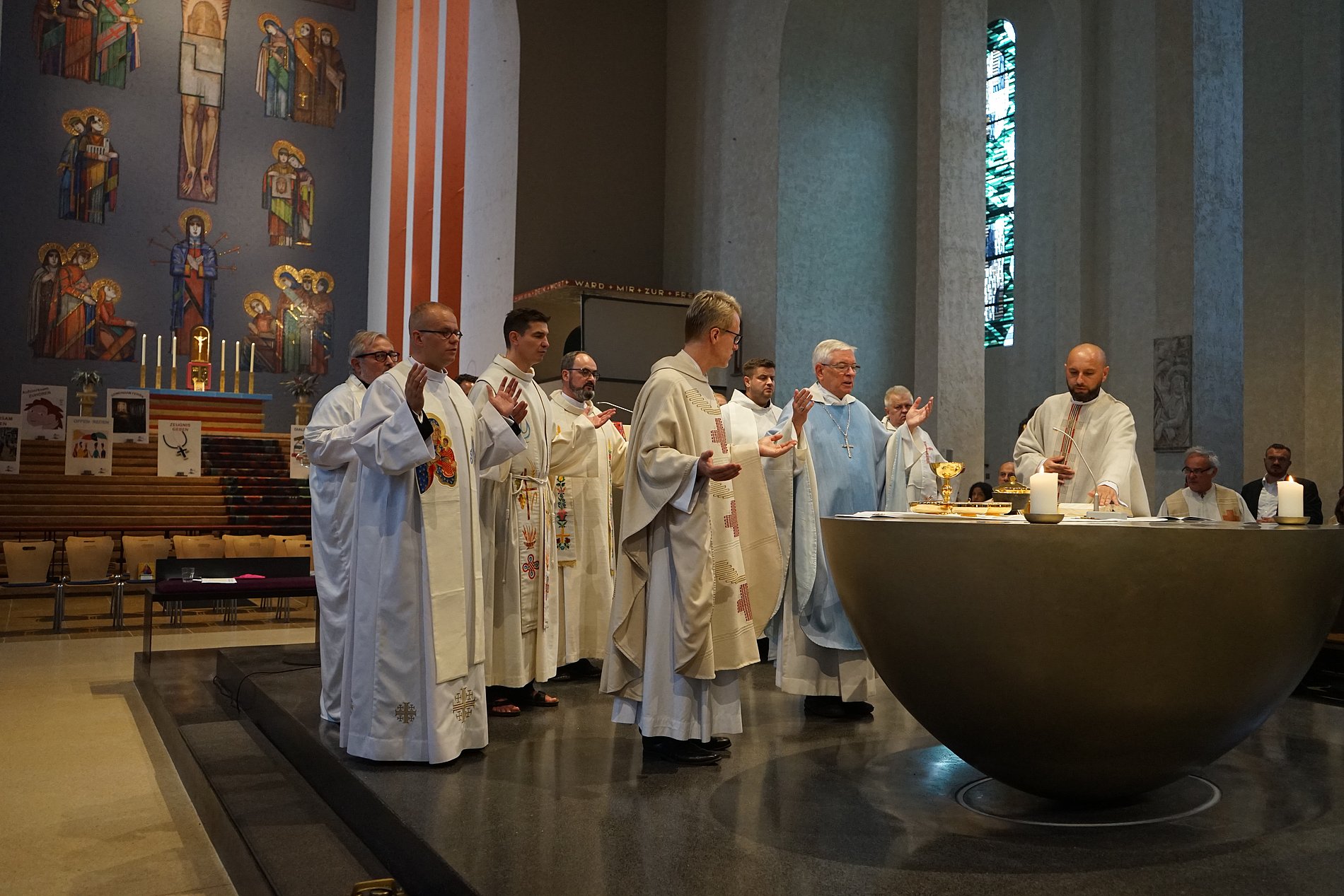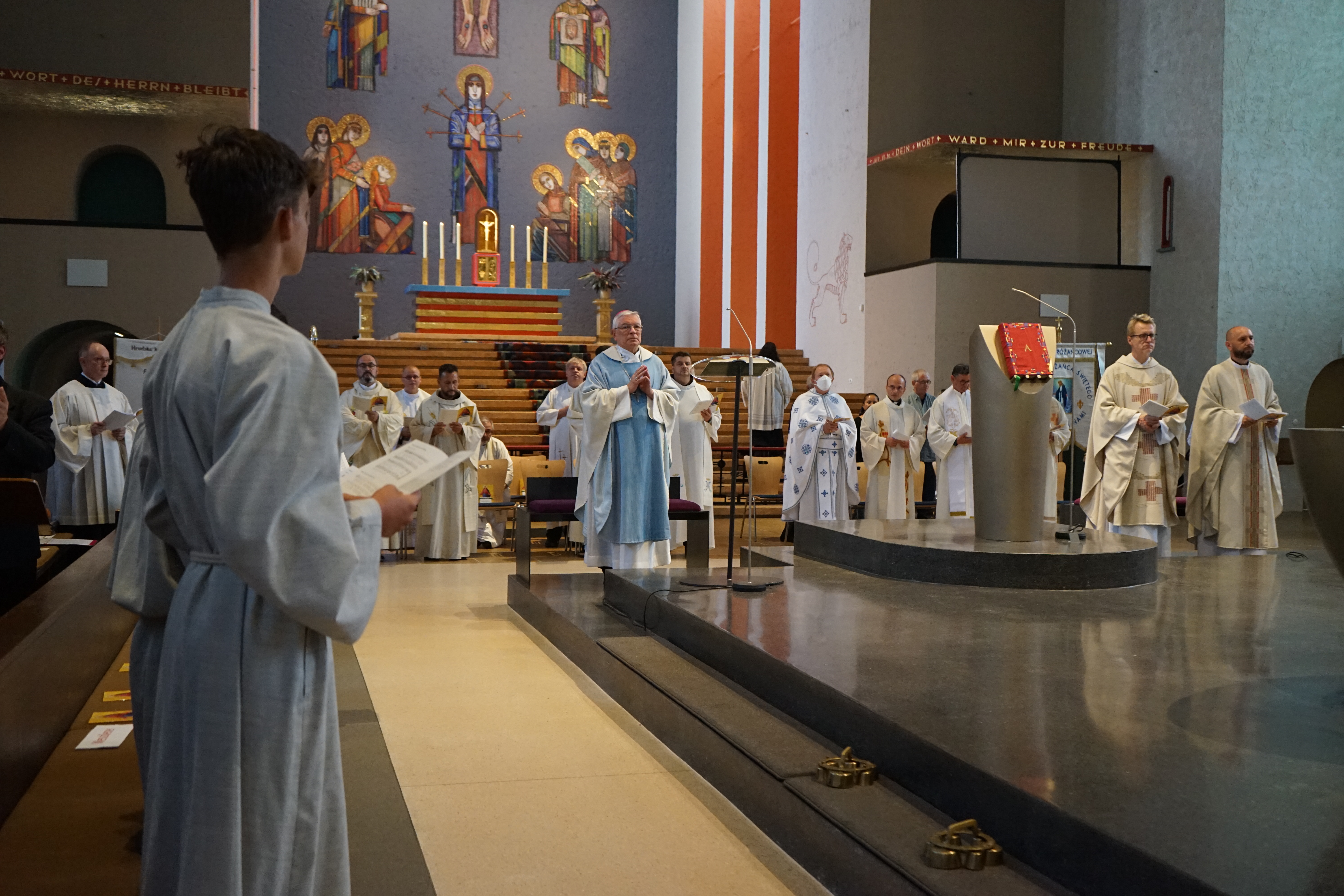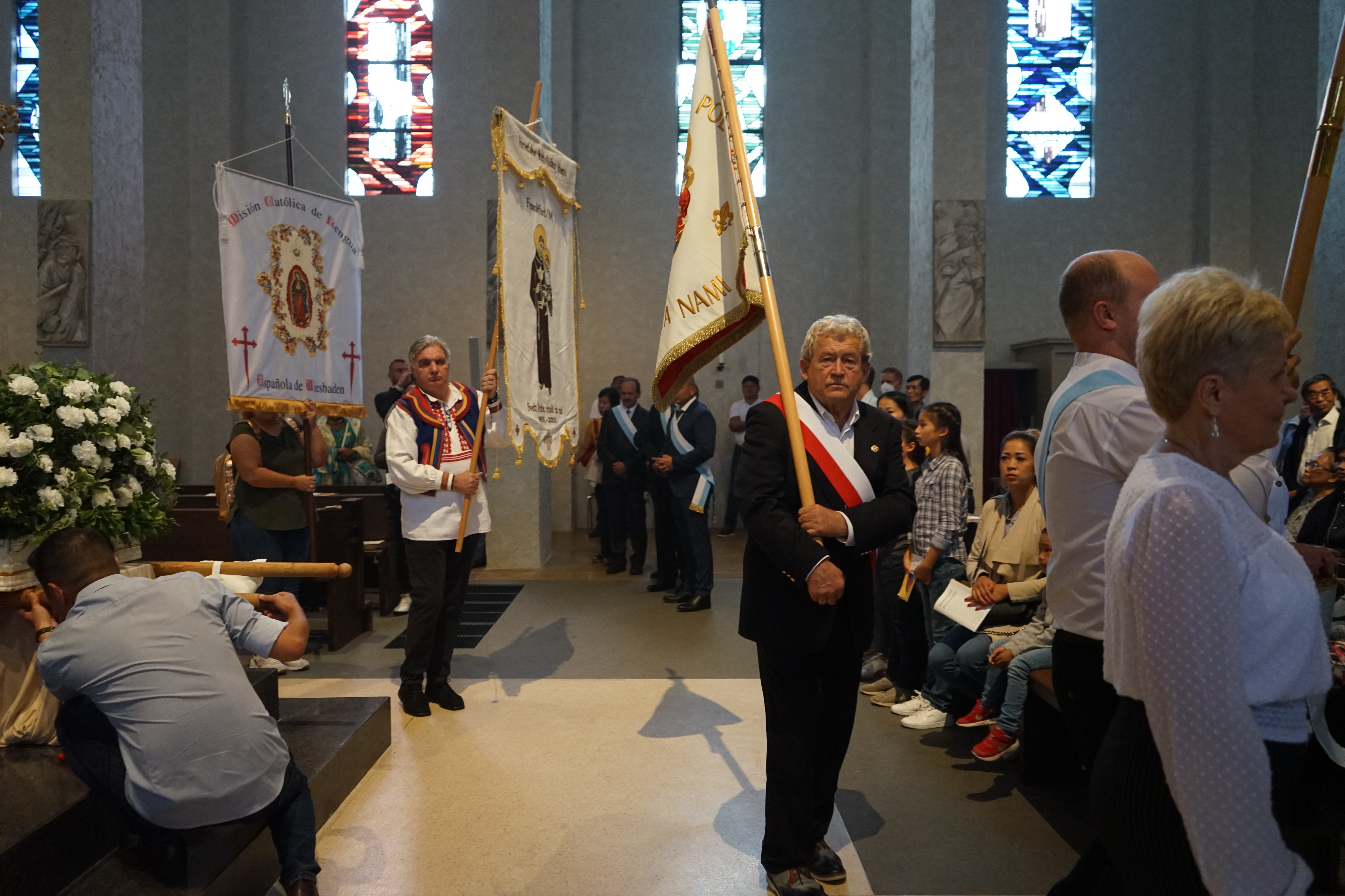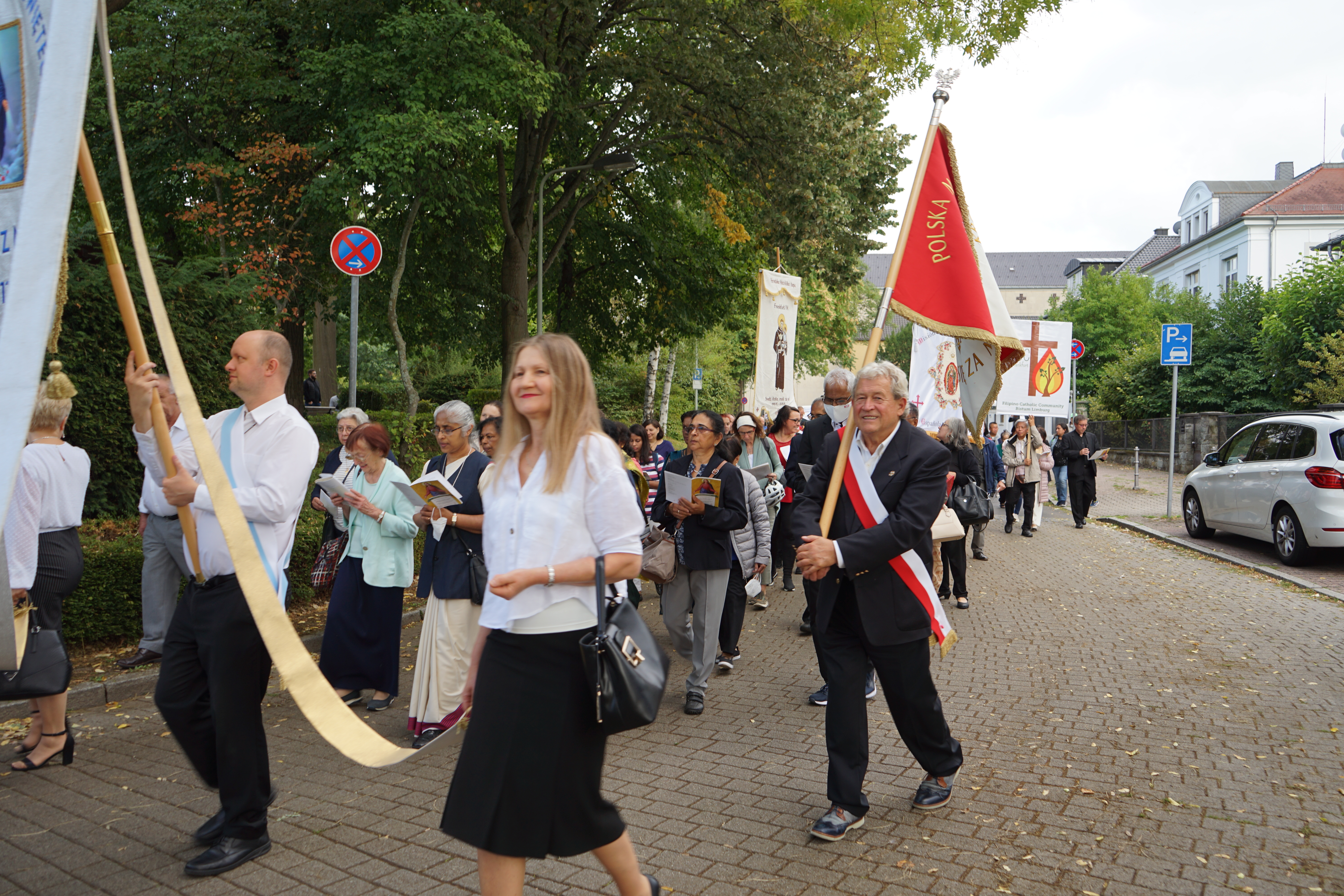 Die in der jeweiligen Sprache vorgetragenen Fürbitten aus den einzelnen muttersprachlichen Gemeinden sind ein zentrales Element des Mariengottesdienstes, der jedes Jahr in zeitlicher Nähe zum Fest Mariä Geburt gefeiert wird. Gebetet wurde für alle Gläubigen in den Kirchen und Pfarreien, für alle ehrenamtlich Engagierten, für die Getauften aller Konfessionen und für die, die sich taufen lassen, für jene, die sich für Verkündigung einsetzen – und auch für Papst Franziskus und seine Botschaft. Die Fürbitte der Ukrainischen Katholischen Personalpfarrei bat um die Förderung einer Kultur des offenen Austauschs und der gemeinsamen Meinungsbildung. Anschließend brachten Frauen und Männer aus den Gemeinden anderer Muttersprachen Tafeln mit Symbolen zu den Schlüsselthemen des Synodalen Prozesses sowie die eucharistischen Gaben zum Altar.