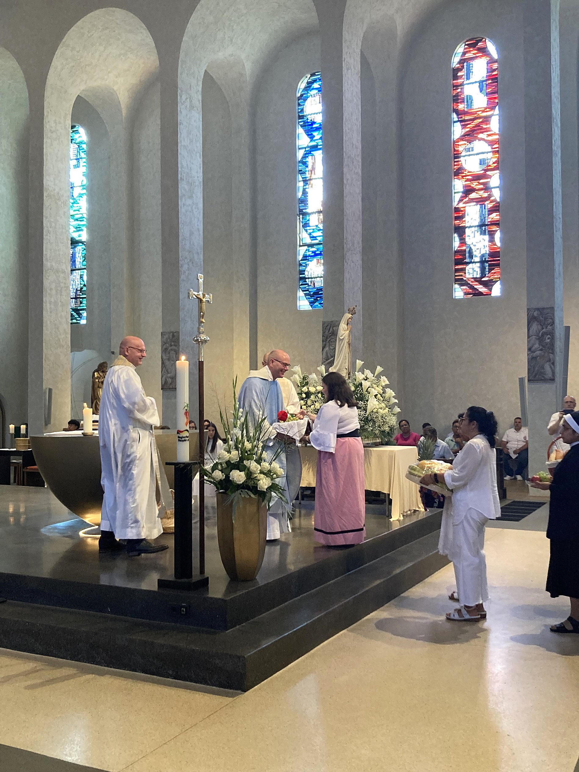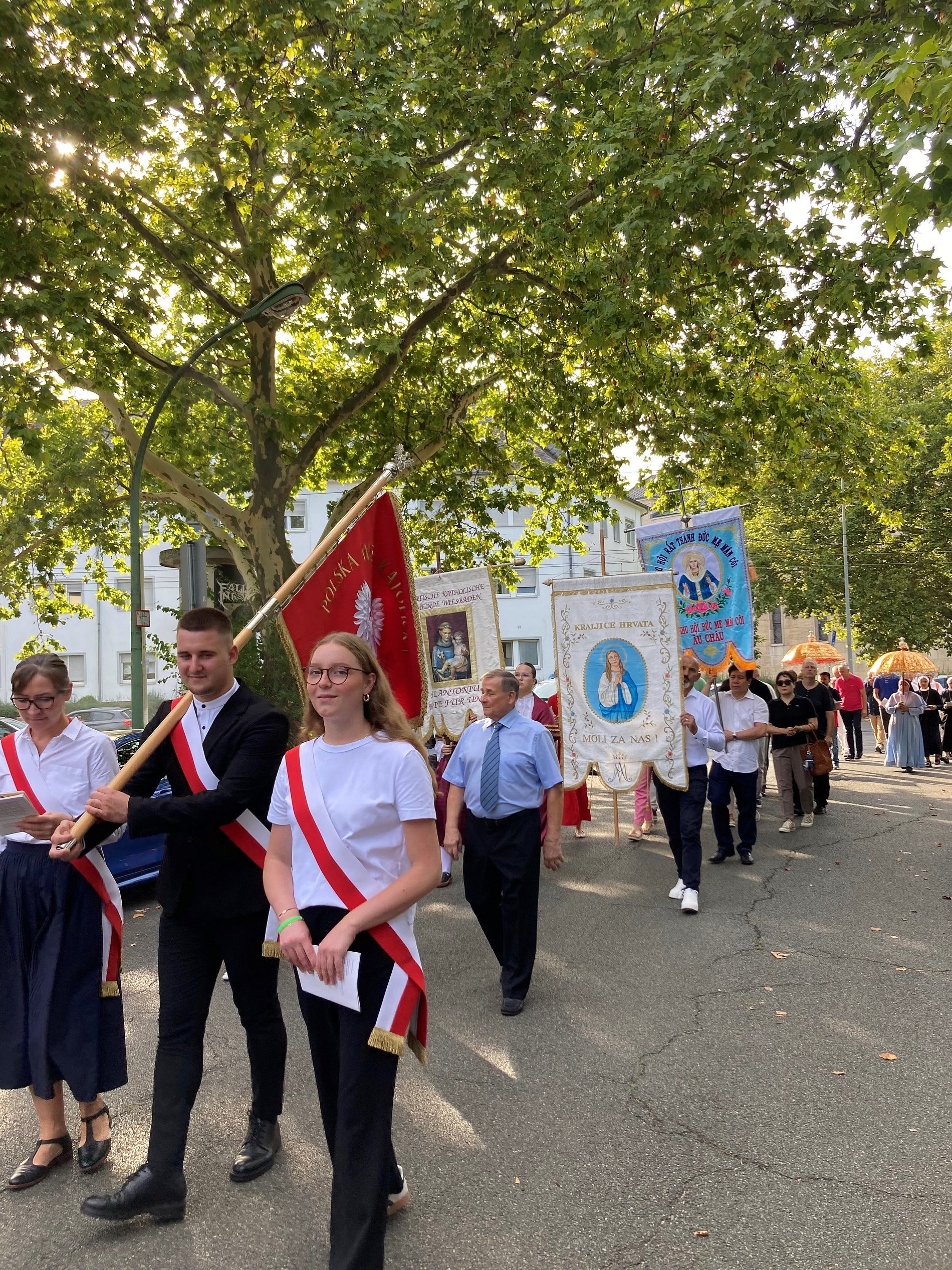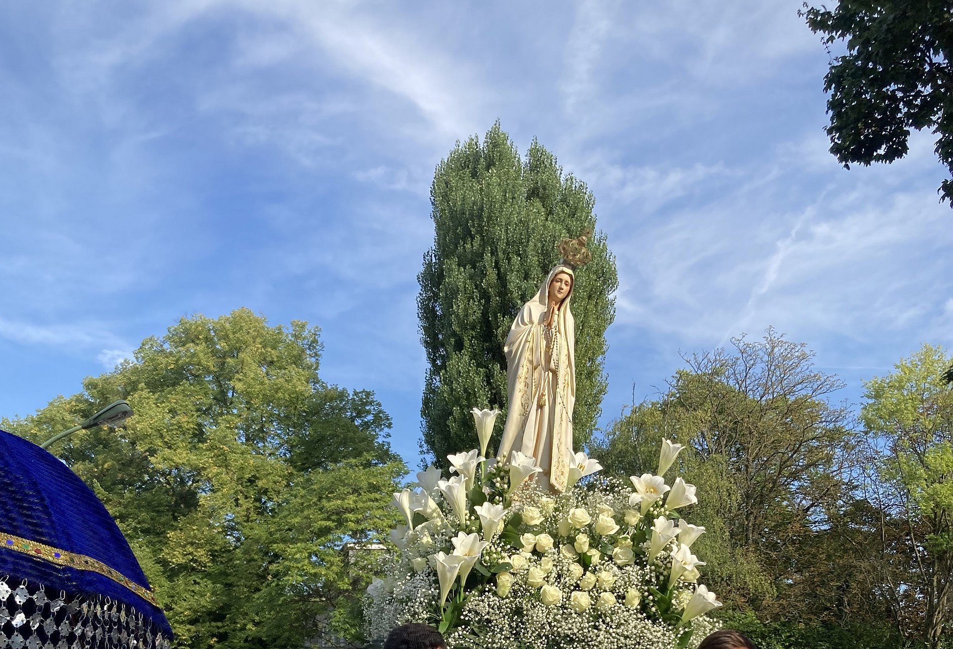 Die Anrufung "Maria, Königin des Friedens" ist der Kern der Hochamtshomilie des Hauptzelebranten, Domkapitulars Georg Franz. Maria gibt uns die Gabe der Einheit und des Friedens; daher: „Bleiben wir nicht bei der Verehrung. Folgen wir Maria, damit wir Frieden in unseren Herzen tragen, die die Welt braucht”. Und die Gläubigen folgen ihr: Der Prozessionszug mit der Marienstatue auf einem prächtigem Sockel weißer Blumen wird durch Gesang begleitet und zieht einige neugierige Blicke auf sich. Die zierliche Statue ist doch schwer und wird abwechselnd von sowohl Männern, als auch Frauen getragen. Nach dem sakramentalen Segen vor der Kirche ist Zeit für Verpflegung und Gespräche.