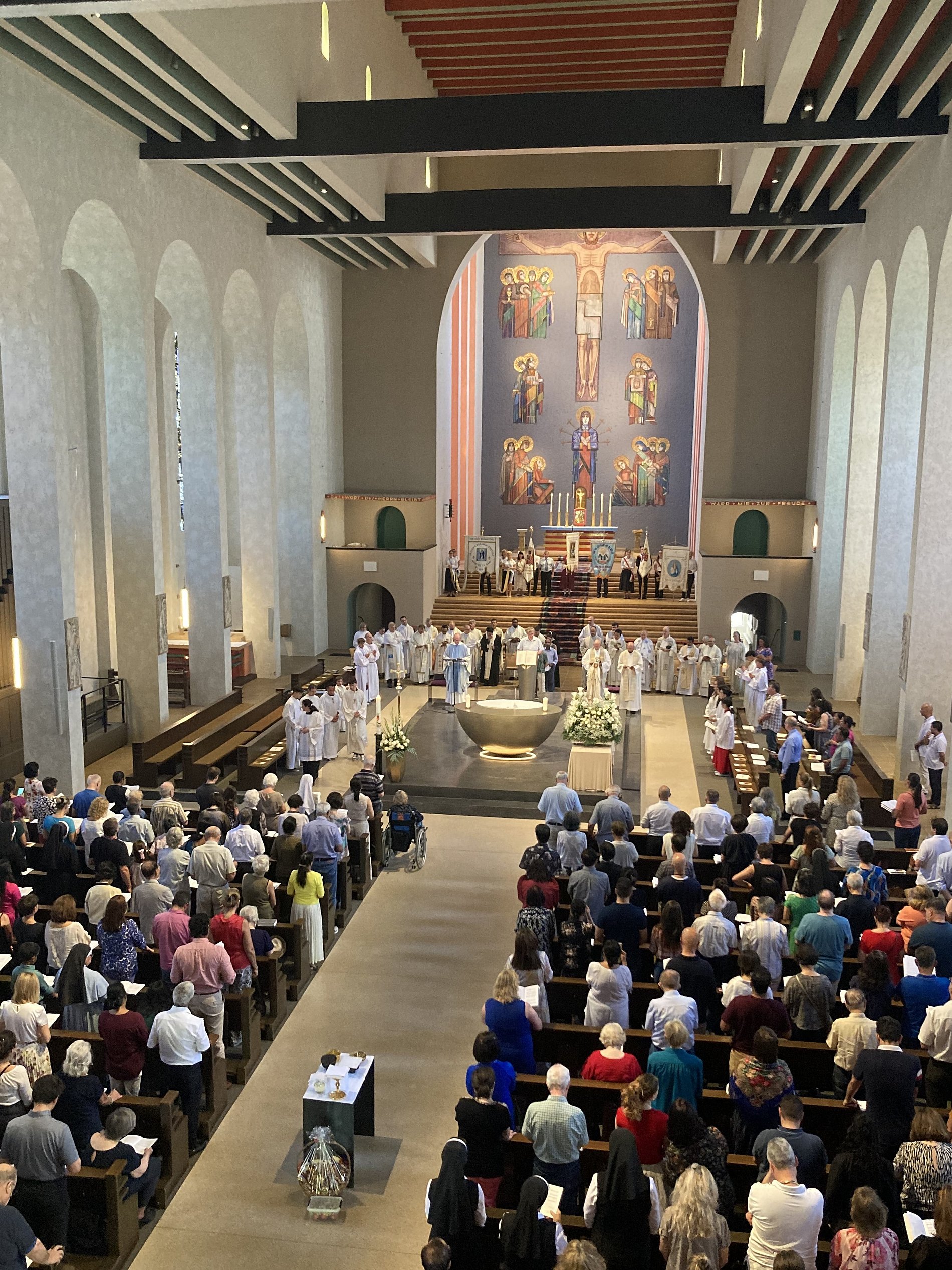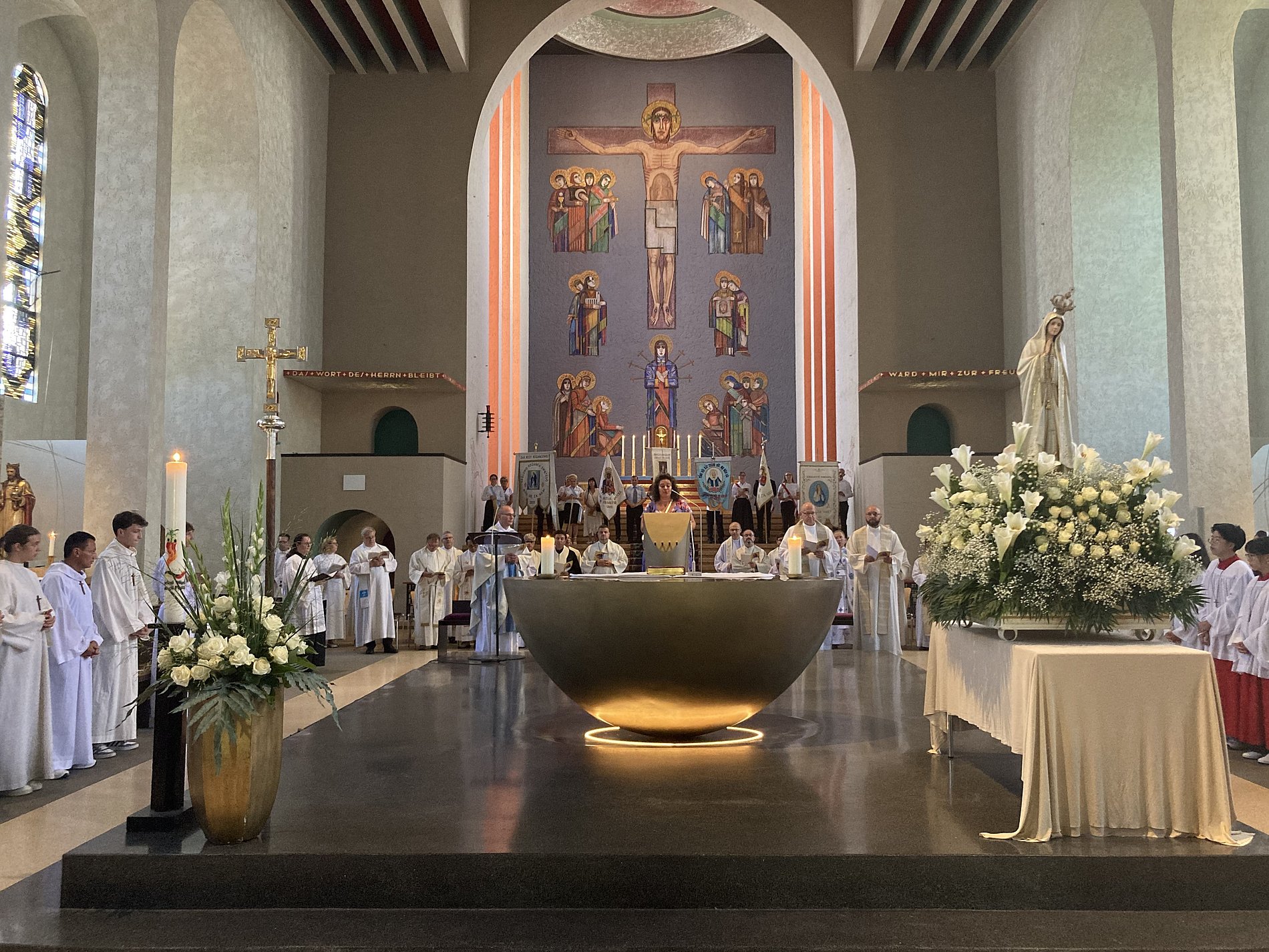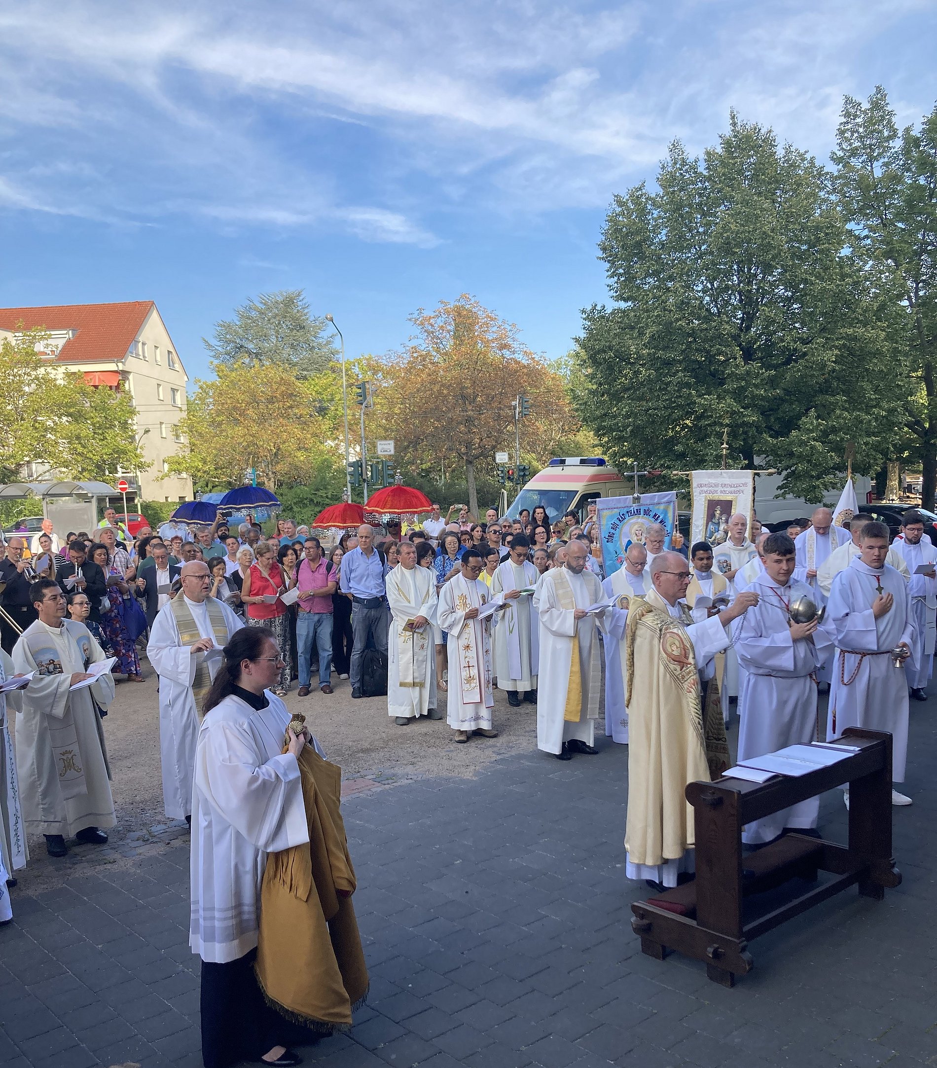 Vor dem Gottesdienst herrscht gespannte Erwartung. Einige Gläubige warten draußen mit den Prozessionswappen ihrer Gemeinden, während in der Kirche der Rosenkranz gebetet wird. Im Rosenkreuzgang der Kirche, dessen Pfeiler die Namen der Gefallenen tragen, versammeln sich die Presbyter, die Pastoralassistentinnen und Pastoralassistenten, um sich in weiße Gewänder zu kleiden; der Maronit Pater Gabi trägt schwarz: Schließlich geht es um die Gemeinden anderer Sprachen aber auch anderer Riten. Draußen stehen seit Stunden aufgeklappte Bänke und Tische für die Erfrischung im Anschluss an die Zeremonie.