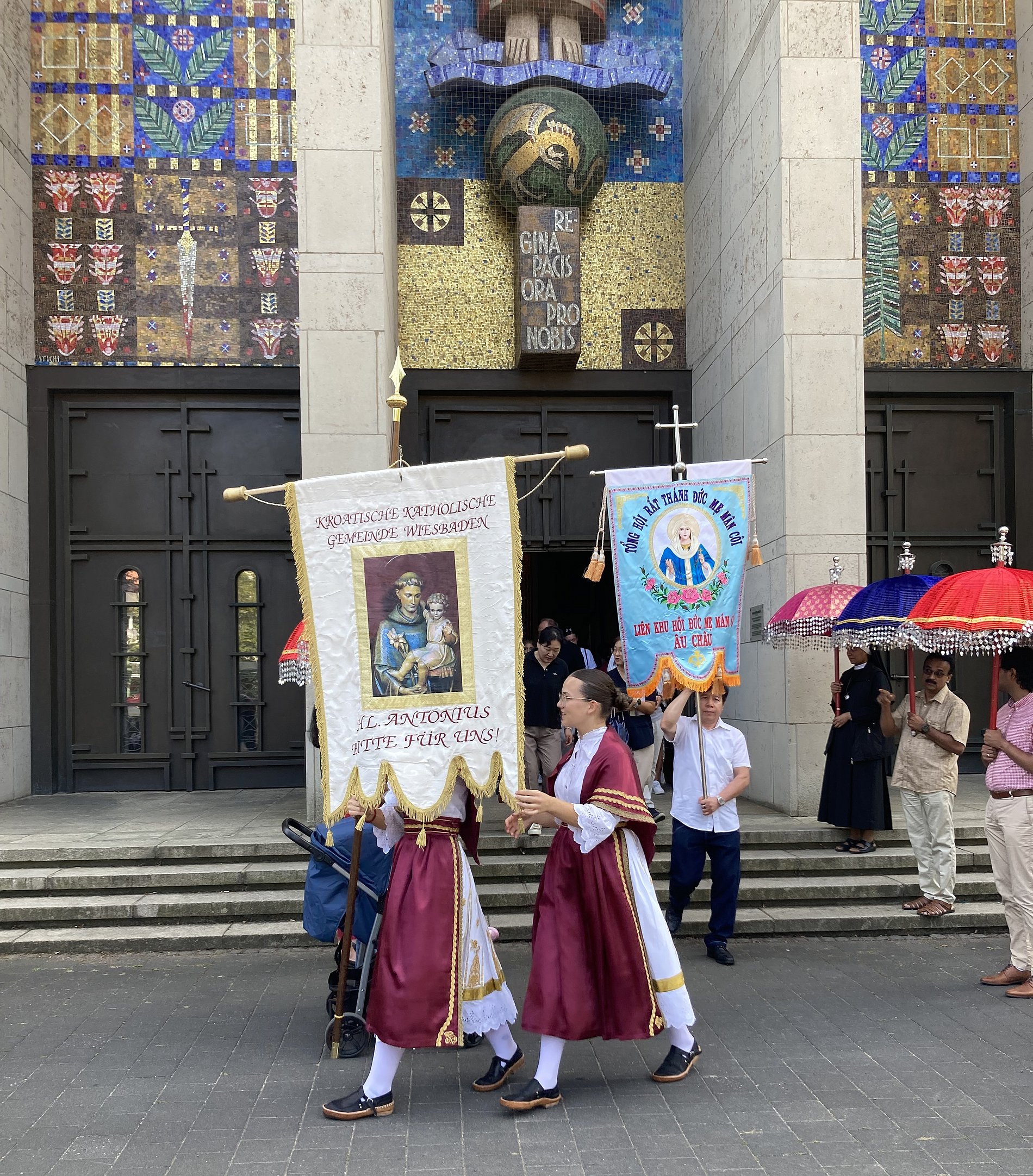 Brasilianerin Sheila aus der portugiesischen Gemeinde in Wiesbaden fühlt den Geist der Gemeinschaft, der das jährlich im September stattfindende Fest einzigartig macht. „Ich bin zum ersten Mal da. Es ist wunderschön, buntgemischt“, sagt sie. Andrea und Mattea aus Wiesbaden, die in kroatischer Tracht gekommen sind, tragen bei der Prozession die Wappen ihrer Gemeinde. Nach getaner Arbeit sind sie entspannt: „Diese Gemeinsamkeit ist besonders: Dass verschiedene Nationen, alle das Gleiche feiern“.